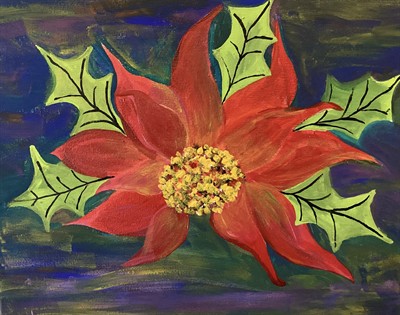 This month’s featured painting is a beautiful hand-painted holiday poinsettia, perfect for the season. Whether you’re a beginner or an experienced painter, our guided session will help you create your own vibrant masterpiece.